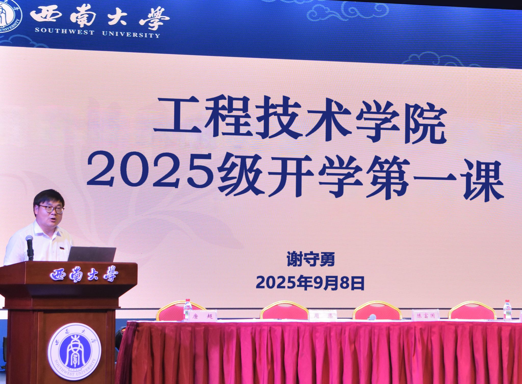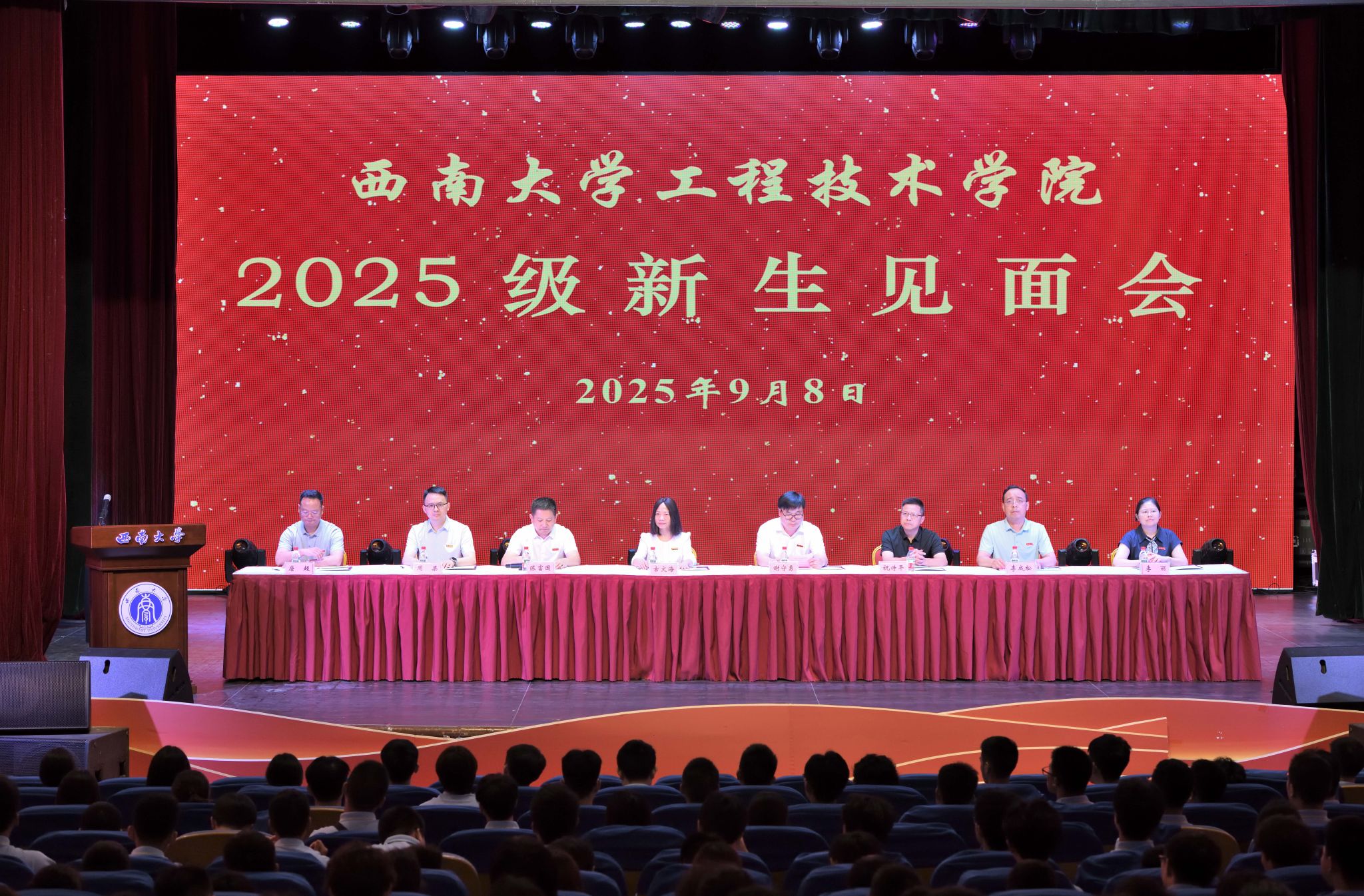 在学校光大礼堂举行2025级新生见面会。学院全体党政领导、教师代表、高年级学生代表及2025级全体新生参会。会议由学院党委副书记、纪委书记陈富国主持。